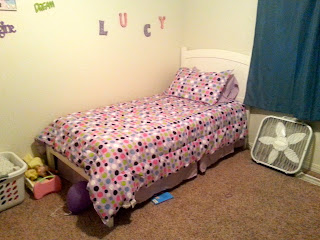 And last but not least, here is Lucy's new Twin bed! She was definitely in need of a bigger bed for her long legs. The toddler bed just wasn't cutting it anymore! This also came from our favorite furniture store. She loves it, and sleeps better too!